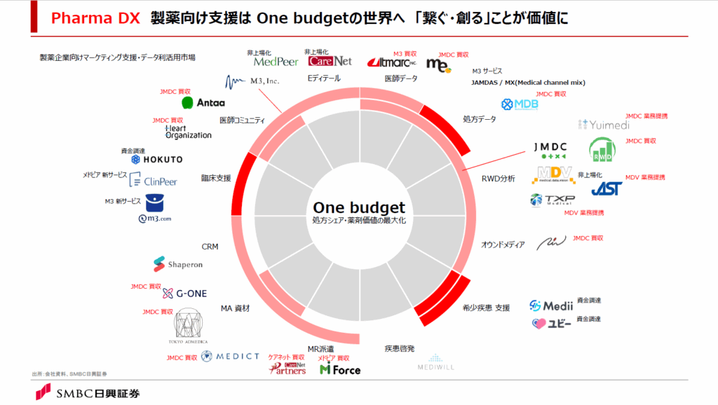 図では、エムスリー(外円)、JMDC(内円)の主要サービス範囲をプロットしています。主にJMDCは買収を通じ、サービス範囲を拡大しています。濃い赤色の部分は、弊社が今年注目している領域です。臨床支援、処方データ、希少疾患支援の3領域は、エムスリー、JMDCが更なる取り組みを模索していると同時に、この数年で資金調達したスタートアップが存在する領域です。新規サービスや事業連携、買収など、各社の動向に注視したいと思います。