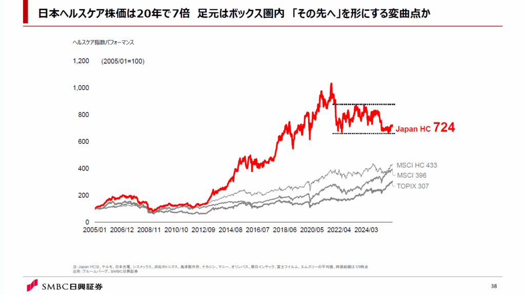 日本のヘルスケア関連企業の株価は長期的には大きく上昇しましたが、この数年は金融環境の変化も相まってボックス圏内に位置しています。ボックス圏を超えるためには、新たな価値提供が求められます。それぞれの業界の中で「その先」として議論されていた未来図を、現実社会で実装できるかが問われます。「その先へ」を形にする変曲点にあると考えています。