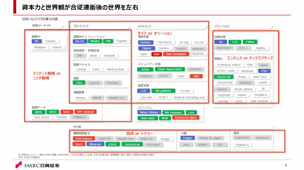 (上の画像は)注目企業100社をマッピングしたもので、青がエムスリー、緑がJMDC、赤がDeNA、MDVとの関係を示しており、買収や事業提携、出資関係を色分けしています。グレーは、医療機器、医薬品卸、商社、通信IT、生損保等のヘルステック周辺の企業群との関係を色付けしています。