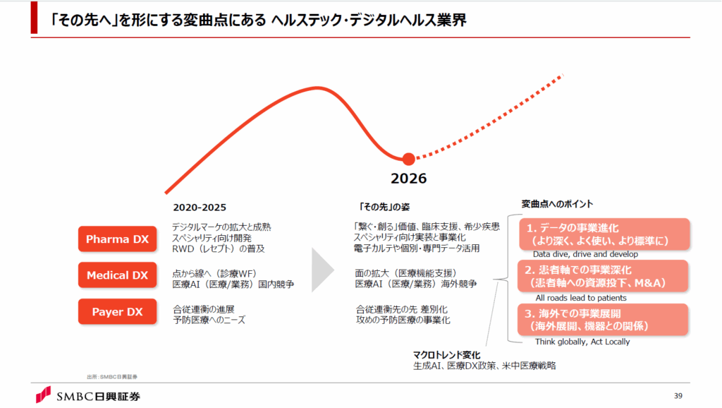 株式会社メディウィルでは、SMBC日興証券株式会社 株式調査部シニアアナリストの徳本進之介氏を招いたオンラインセミナー「2026年 ヘルステック・デジタルヘルス業界最新動向~『その先へ』を形にする変曲点にある~」を2026年1月22日に開催しました。