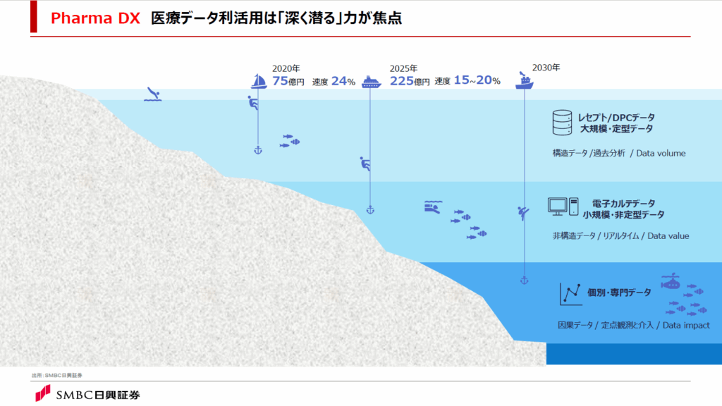 医療データの利活用が、製薬企業のマーケティング、メディカルや研究開発の分野で進んでいます。医療データの二次利活用市場は、2020年から2025年にかけては毎年 約24%の成長となっていました。医療データ利活用は、海に潜るダイビングのようなものだと考えています。つまり、深く潜るほどインサイトがあるが、求められるテクノロジーとノウハウが大きくなります。2025年時点では、健保や病院からのレセプトを活用したサービスの浸透率がかなり進みました。そして2030年に向けては、第二層目の電子カルテデータや第三層目の個別・専門データの利活用がどこまで進んでいくのかが注目点です。