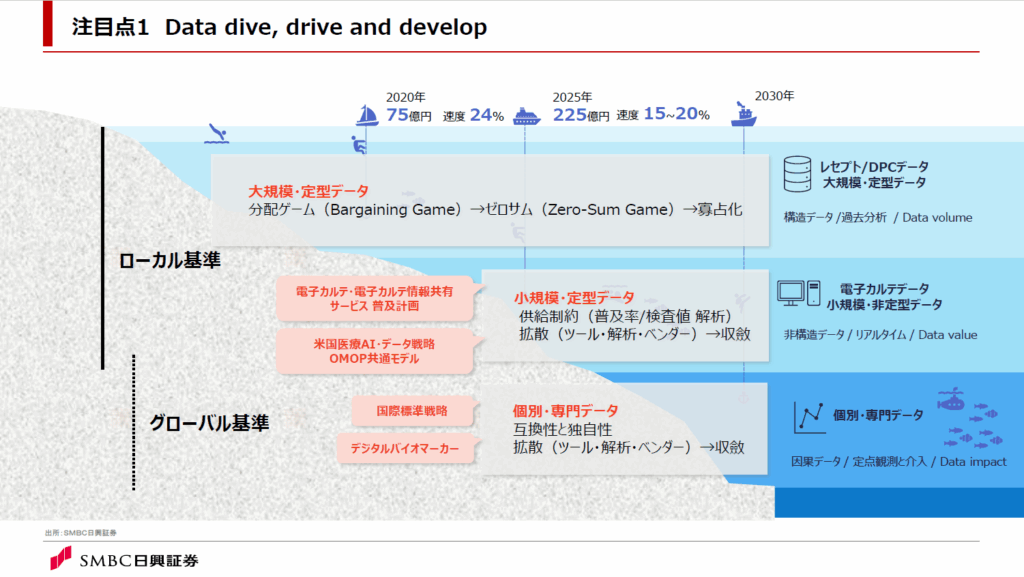 Drive(実装)の観点では、二層目(深海)における電子カルテデータの利活用に注目しています。2025年で医療データの二次利活用としては約225億円の売上高があったと弊社は推定していますが、電子カルテ由来のデータ利活用は、二桁億円にまだ満たない状況です。電子カルテは病院や医師ごとの個別性やベンダーの多さから利活用には課題がありました。
