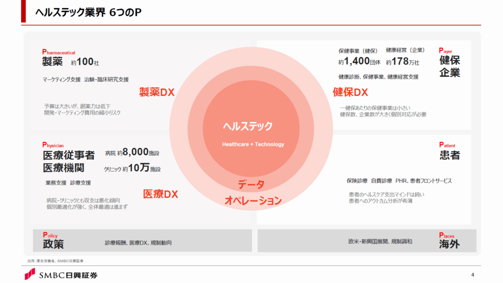 今までの講演では、ヘルステック業界のステークホルダーを4つのP(※)に分けて事業環境を概観してきました。今年は、従来のPに加えて、「ポリシー(Policy、政策)」と「プレース(Place、海外)」を取り巻く環境についても注目していきたいと思います。