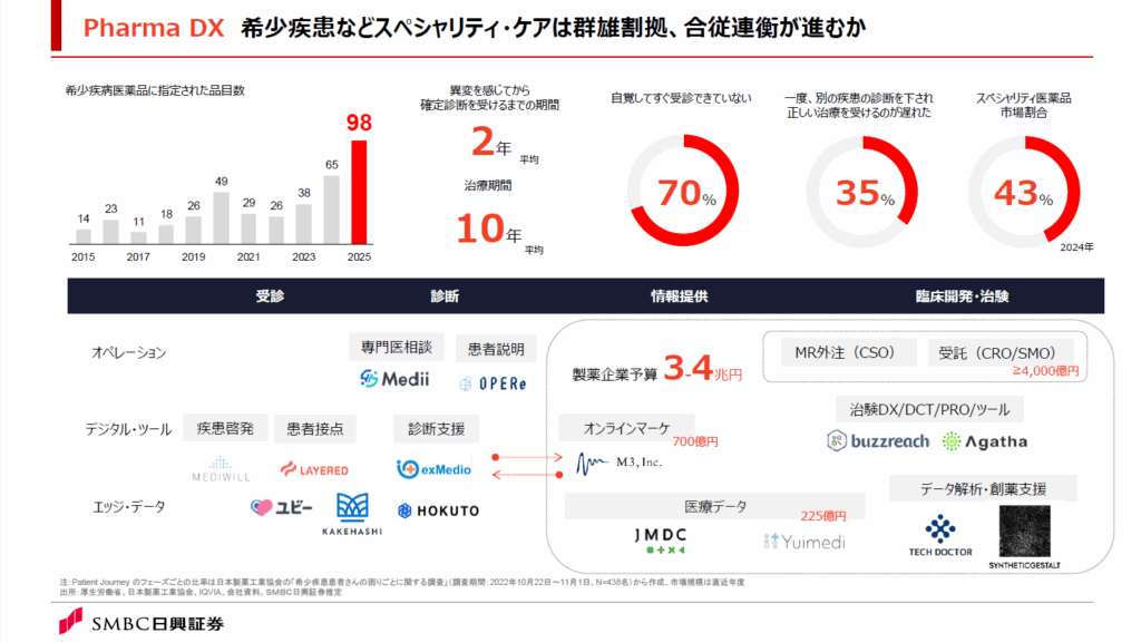 例えば、医療情報やデータを扱う領域は、医療機関における患者との接点(フロントエンド)との事業シナジーが構築しやすいことから、この領域では、エムスリーがm3.com、デジカル、デジスマ診療を通じてドミナント戦略をとる一方で、JMDCが買収を通じ多角化を進めています。大手のドミナント戦略に対し、疾患啓発、早期診断、医療アクセス支援の領域では、専門領域のニッチ特化型での事業展開が目立ちます。