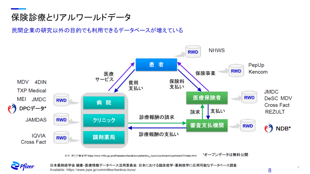 保険診療のプロセスで、RWDが発生する場面を考えます(画像2)。まず、患者さんは病院やクリニック、調剤薬局の保険診療科でサービスを受けると、その診療報酬が審査支払機関に請求されます。ここで、RWDとなるレセプトが発生します。さらに、審査支払機関から保険組合などの医療保険者にレセプトが送られ、それに応じて支払がされます。医療保険者や支払機関に貯められたレセプトが、DBとして利用されます。