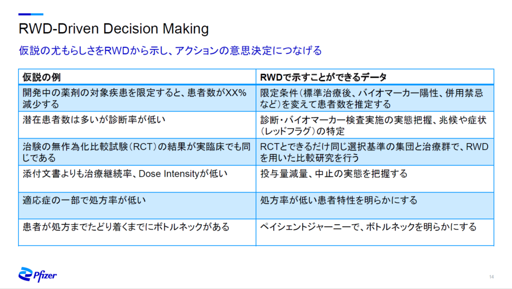私たちはビジネスの課題に取り組む際、様々な仮説を立てています。その仮説のもっともらしさをRWDから示すことで、課題に対するアクション(何を行うのか)の意思決定につなげられます(画像4)。