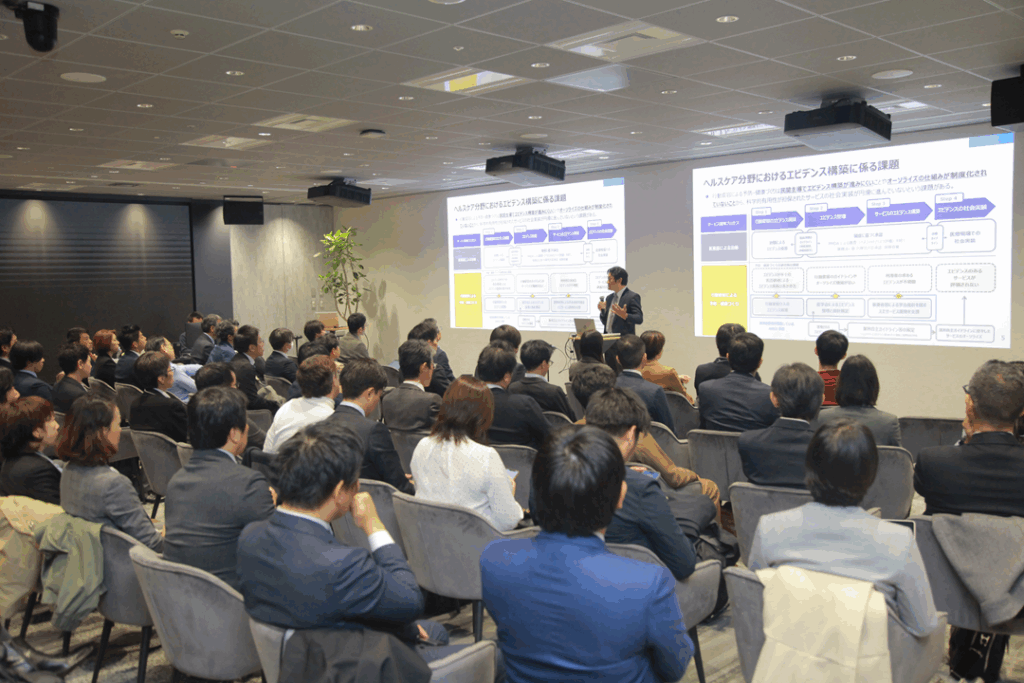 神氏は「企業単位の規制改革ツールとその活用事例」をテーマに、グレーゾーン解消制度など企業単位の規制改革ツールの概要やそれらの活用事例を紹介。平井氏は「経済産業省における質の高いヘルスサービスの創出・振興について」を演題に、経済産業省が健康・医療・介護分野で担う役割や、民間主導ではエビデンス構築が進みにくい「行動変容による予防・健康づくり」で同省が実施している事業等を説明しました。